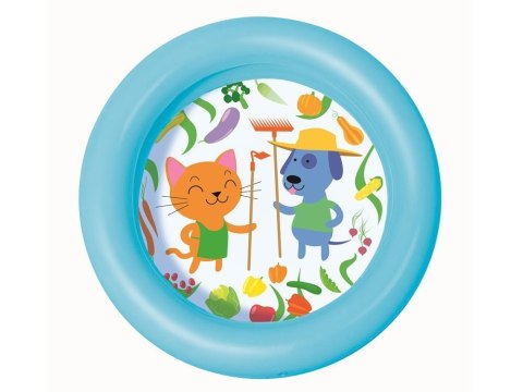 Niebieski okrągły brodzik - basenik dmuchany o wymiarach 61cm x 15cm to produkt przeznaczony dla maluszków. Basenik został wykonany z wytrzymałego winylowego materiału, posiada dwie komory powietrzne oraz zawór bezpieczeństwa chroniący przez upływem powietrza. Składa się z 2 dmuchanych pierścieni, każdy z nich jest osobno pompowany. Na dnie basenu nadrukowane są wesołe zwierzątka, które umilą każdą kąpiel. Pojemność brodziku to 21 litrów przy zalecanym wypełnieniu na poziomie 75%. Niewielki rozmiar i waga pozwalają na zabranie go w dowolne miejsce, na plażę, trawę w ogrodzie lub wakacyjny wyjazd.