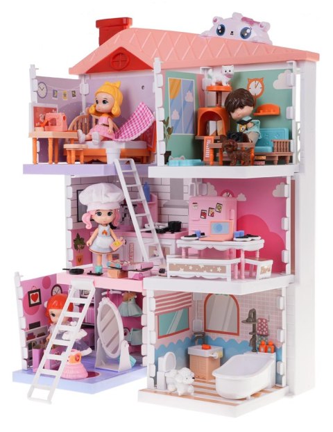 Śliczny, bogato wyposażony domek dla lalek z licznymi akcesoriami i 4 figurkami postaci w zestawie dla dzieci od 3-go roku życia. Domek składa się z 3 kondygnacji. Na parterze znajduje się bogato wyposażona garderoba i łazienka. Schodami w górę dostajemy się na drugie piętro, gdzie znajduje się kuchnia, a piętro wyżej, pokój dzienny i sypialnia. Wszystkie pomieszczenia wyposażono w meble i niezbędne sprzęty użytku domowego. Do zestawu dołączono również 4 figurki, 3 dziewczynki i jeden chłopiec. Cały zestaw wykonano z najlepszych materiałów i zadbano o dopracowanie najdrobniejszych szczegółów. Fantastyczne, żywe kolory przyciągają wzrok i zachęcają do zabawy. Niebywałą atrakcją zestawu możliwość rozłożenia domku na pojedyncze pomieszczenia i bawienia się nimi z osobna.
