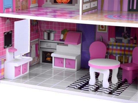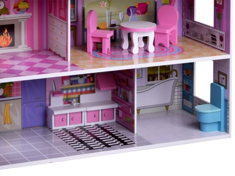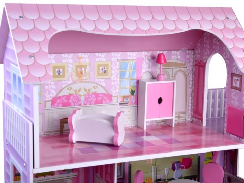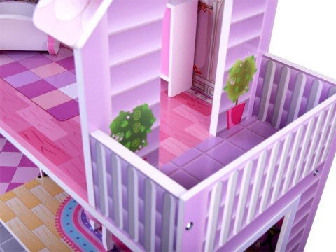 Stylowy domek dla lalek z trzema piętrami, pięcioma pomieszczeniami i tarasem pomieści mnóstwo gości w swoich apartamentach. Dom wyposażony w meble, oświetlenie ledowe rozprowadzone na każde piętro, po prostu ful wypas! Dom zachowany w tonacji różu, fioletu wykonany bardzo efektownie z świetną grafiką danych pomieszczeń.