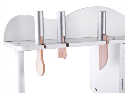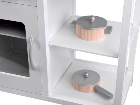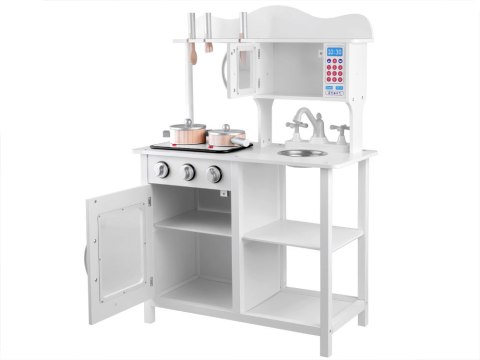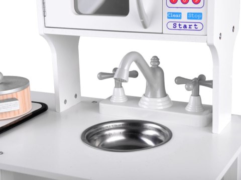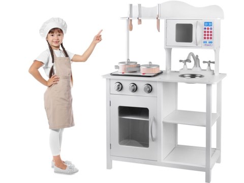 Elegancka, biała kuchnia z garnkami do zabawy w dom zapewni każdemu małemu kucharzowi mnóstwo wesołej zabawy. Kuchnia wyposażona w płytę indukcyjną z efektem dźwiękowym i świetlnym, metalową stylową miskę służącą za zlewozmywak, kran z obracanymi kurkami. Drzwiczki szafek zamykane na magnes. Stylowa kuchnia z drewnianymi garnkami i sztućcami zapewni wyśmienitą zabawę każdemu małemu dziecku. Na płycie indukcyjnej słychać efekt bulgotania wody, gotowania.