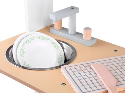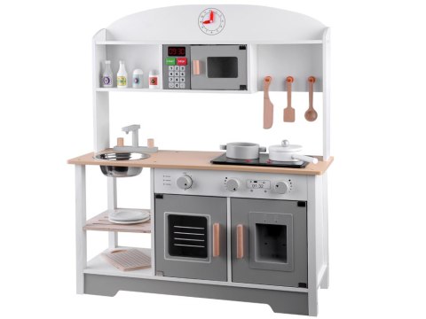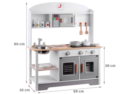 Duża, drewniana kuchnia dla dzieci z akcesoriami do zabawy w dom zapewni każdemu małemu gospodarzowi mnóstwo kreatywnej zabawy. Mebel wykonany jest w całości z drewna, pomalowany bezpieczną farbą. Jedynie zlewozmywak wyjmowany to metalowa miska. Zabawa w dom, gotowanie jest jedną z zabaw, które dzieci uwielbiają.