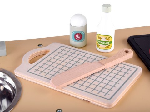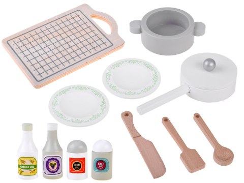 - akcesoria kuchenne: drewniana łyżka, łopatka, nóż, patelnia, garnek z pokrywką, deska do krojenia, 2 x talerz płaski