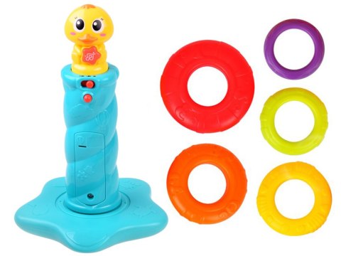 W trakcie nakładania obręczy na pałąk dziecko za każdym razem usłyszy wesoły odgłos, a to kwakanie kaczki, wesołe dźwięki całej zabawie towarzyszy migające światełko na brzuszku kaczuszki. W momencie gdy dziecko się nie bawi kaczuszka domaga się wesołymi dźwiękami aby się nią zainteresować. Zabawka bardzo efektowna, zainteresuje każdego malucha.