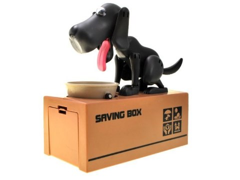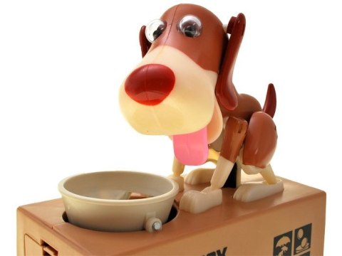 Wrzucamy monetę do miski pieska, która znajduje się przed nim, wówczas pod wpływem dotyku piesek zaczyna się ruszać tak jak by zjadał jedzonko z miski, co skutkuje iż moneta wpada do skarbonki. Piesek w trakcie zjadania pieniążka śmiesznie się porusza i trzepie uszkami. Do uruchomienia skarbonki potrzebne są 3 baterie. Skarbonka nauczy nasze dzieci oszczędzać pieniądze oraz dostarczy im dużo rozrywki, a także pomoże zrozumieć, że oszczędzanie jest całkiem fajne i niesie za sobą same pozytywy. Monety możemy swobodnie wyjąć przez otwór, który jest zasłonięty zaślepką.