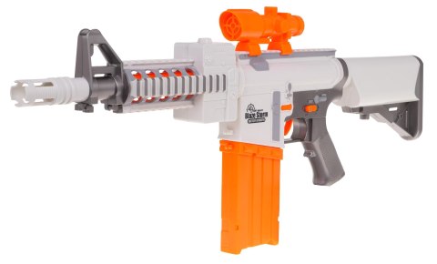 Półautomatyczny karabin na pociski dla dzieci od 8-go roku życia. Pistolet wyposażono w duży wysuwany magazynek, mieszczący 10 pocisków i celownik. Użycie karabinu jest bardzo proste, wystarczy namierzyć cel, naładować i przycisnąć spust. Pocisk poszybuje na odległość ok. 15 metrów. Karabin zasilany jest bateriami typu 5 x AA 1,5 V (brak w zestawie). Cechy produktu: - przeznaczony dla dzieci od 8-go roku życia, - wykonany z najlepszej jakości plastiku, - karabin półautomatyczny, - typ ładowania - magazynek ładowany od spodu, - pojemność magazynku 10 pocisków, - regulowany celownik, - piankowe pociski z gumową końcówką. |