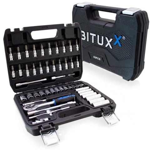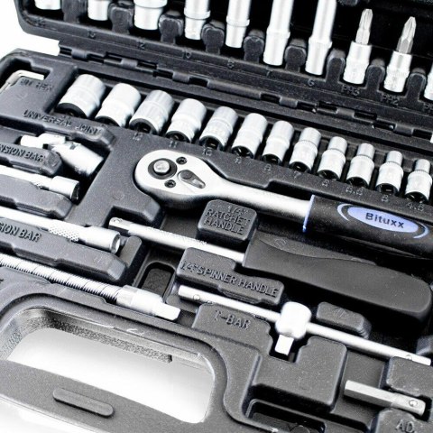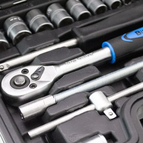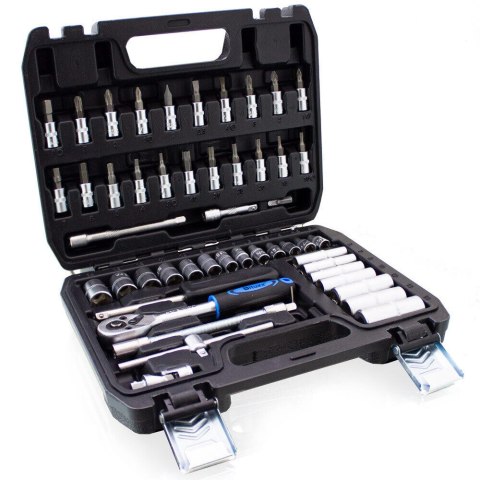 Solidny zestaw narzędzi 45 elementów zawiera bity, nasadki, klucz zapadkowy oraz dodatkowe akcesoria które zostały wykonane z wytrzymałej, narzędziowej stali chromowo-wanadowej. Idealny zarówno do drobnych napraw jaki i również do profesjonalnych warsztatów. Zestaw umożliwia pracę wymagającą bardzo dużych obciążeń i precyzji, pozwala wykonywać wiele czynności serwisowych związanych z odkręcaniem i przykręcaniem połączeń gwintowych o różnych rozmiarach nominalnych.Grzechotka 72 zęby (skok roboczy 5 stopni).