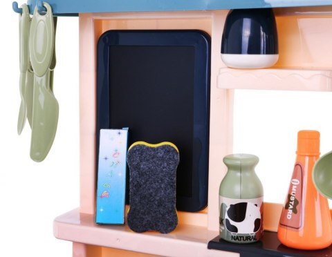 | Kuchnia to zabawka, którą kochają zarówno dziewczynki jak i chłopcy. Prezentowany przez nas zestaw jest przeznaczony dla dzieci od 3-go roku życia. Posiada efekty dźwiękowe i świetlne. Jest niewielkich gabarytów, co jest istotne w dzisiejszych czasach, kiedy dzieci mają pokoje przepełnione zabawkami. Konstrukcja stabilna, estetyczne wykonanie, pastelowe kolory, bogate wyposażenie. Zasilanie bateriami typu 3 x AA - brak w zestawie. Kuchnia posiada kran ze zlewem, z którego leci woda, podświetlane palniki z odgłosami gotowania i smażenia, funkcja pary na jednym z palników, tablicę do sporządzania notatek, otwieraną lodówkę, a także 42 akcesoria kuchenne takie jak: sztućce, garnki, talerze, owoce, warzywa itp. |