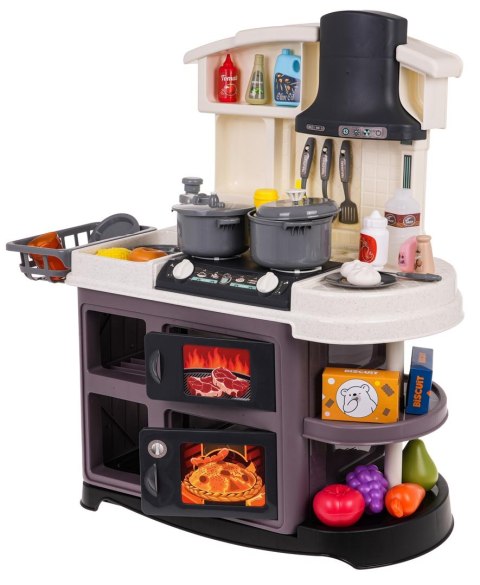 Interaktywna kuchnia z funkcją światła, dźwięku i kranikiem, z którego wydobywa się woda, a także mnóstwem akcesoriów, dla dzieci od 3-go roku życia. Kuchnia została znakomicie wykonana, z najlepszej jakości plastiku i jest w żywych kolorach zachęcających dziecko do zabawy. Na blacie kuchni znajduje się interaktywna płyta z palnikami. Po przekręceniu jednego z pokręteł słychać odgłosy gotowania, a drugiego, odgłos smażenia, któremu towarzyszy podświetlenie palników. Po dodaniu paru kropelek wody na palnik wydobywa się z niego zimna para wodna. Z kranu faktycznie wypływa woda, jak w prawdziwym zlewie, dziecko będzie mogło umyć zabawkowe naczynia. W zestawie mamy też atrapę piekarnika z otwieranymi drzwiczkami i atrapę grilla z otwieranymi drzwiczkami oraz mnóstwo półeczek, na których ułożyć możemy atrapy produktów. Cały zestaw prezentuje się znakomicie. Zabawka zasilana jest bateriami typu 3 x AA 1,5 V (brak w zestawie).