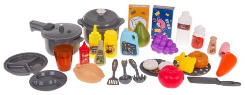 - atrapy produktów spożywczych: pomidor, marchewka, kurczak, ryba, gruszka, winogrona, 2 x beza, ciasto,