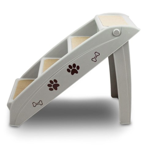 Można go złożyć, aby zaoszczędzić miejsce i np. schować w samochodzie. Dzięki maksymalnej nośności schody są również bardzo solidne, a jednocześnie bardzo lekkie. Stopnie są pokryte antypoślizgowym filcem, dzięki czemu zapewniają dobre wsparcie.