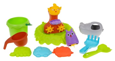 Zestaw piaskownica z funkcją wody dla dzieci od 3-go roku życia. Zabawka idealna do zabawy na plaży czy w ogrodzie. Wykonana z najlepszej jakości materiałów, w żywych kolorach. Piaskownica zbudowana jest w kształcie drzewa z 4 poziomów. Wlewając wodę na najwyższych poziomach, przelewa się ona przez kolejne, poruszając jednocześnie kółeczkami zębatymi przymocowanymi do zabawek i zbiera się na samym spodzie. W zestawie znajduje się wszystko, co niezbędne do zabawy, czyli piaskownica w kształcie drzewa, wiaderko, konewka, 3 foremki, łopatka i grabki nalewak.