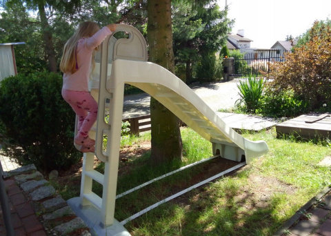 Zjeżdżalnia ma wytrzymałą i stabilną konstrukcję, dzięki czemu gwarantuje bezpieczną zabawę. Pod drabinką znajduje się stopka, która zabezpiecza, aby zjeżdżalnia nie przewróciła się na boki, ponadto całość spięta jest pasami, które łączą ślizg z drabinką - zabezpieczają, aby całość konstrukcji była stabilna.