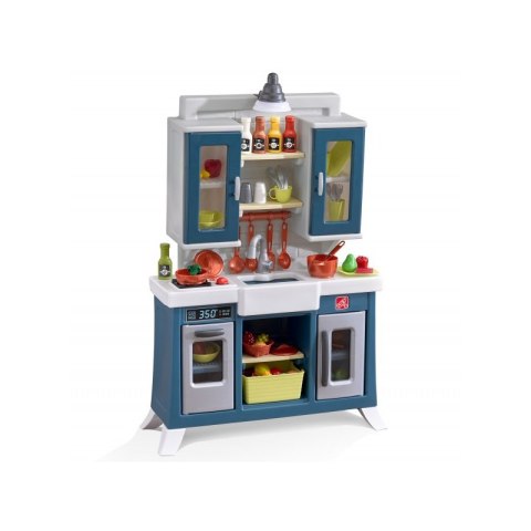 Dziecięca kuchnia do zabawy firmy Step2 charakteryzuje się realistyczną estetyką wiejskiego szyku z nowoczesną funkcjonalnością i mnóstwem miejsca do przechowywania! Przygotuj posiłki na dużym blacie ze sztucznego granitu. Sięgnij do górnych szafek z półkami przeznaczonych na kubki i talerze do nakrycia stołu. Zabawka posiada zlew w wiejskim stylu z kranem, realistyczny „miedziany" wiszący drążek do przechowywania. Ta kuchnia jest stylowym dodatkiem każdej przestrzeni do zabawy. Palnik elektroniczny posiada zabawne światła i realistyczne odgłosy skwierczenia, a działająca lampa wisząca nad zlewem urzeczywistnia zabawę w kuchni Produkt wymaga 2 baterii „AA" i 2 „AAA" (brak w zestawie)