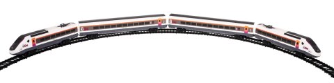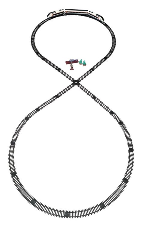 - 2 x lokomotywa, - 2 x wagony kolejki, - elementy konstrukcyjne toru, odcinki proste, zwrotnica, - sygnalizacja świetlna, - stacja, - słup, - 2 x drzewko. |