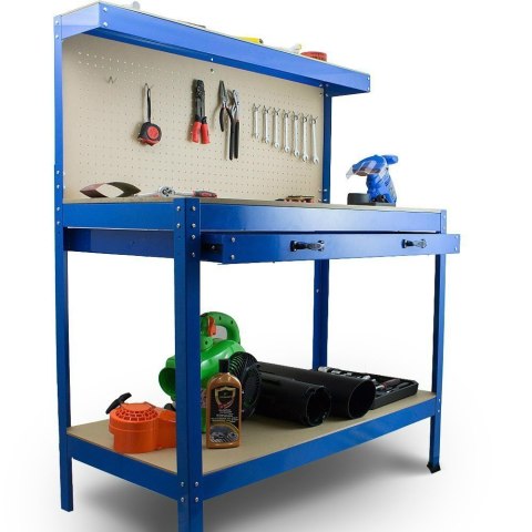 Nasz stół znajdzie praktyczne zastosowanie w każdym warsztacie, garażu czy pomieszczeniu gospodarczym. Duża szuflada na przechowywanie narzędzi, uchwyty na których można powiesić klucze i półka na dowolne akcesoria.W twoim garażu nareszcie zapanuje porządek. Stół został wykonany z wysokiej jakości materiałów dzięki czemu jest stabilny i wytrzyma obciążenie do 100kg. Teraz majsterkowanie będzie prawdziwą przyjemnością.