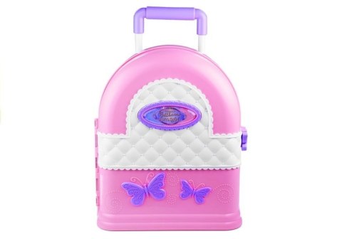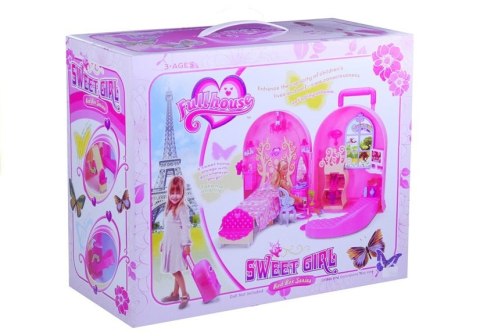 Złożony domek przypomina bardzo dziewczęcą, pastelową walizeczkę z długą rączką. Jasne, różowo-fioletowe kolory połączone są z białymi dodatkami, co z pewnością spodoba się każdej dziewczynce. Wnętrze walizeczki kryje kompletny zestaw elementów potrzebnych do zabawy lalką.
