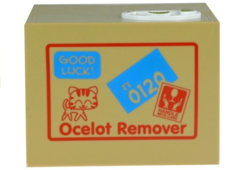 Naciśnij przycisk na budce a kot dźwignie pokrywkę i łapką wciągnie pieniążka.