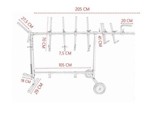Stojak jest mobilny i z łatwością można go przestawiać co znacznie ułatwia pracę w warsztacie. Posiada 2 koła pokryte gumą odporną na środki używane w zakładach lakierniczych. System obrotowy blokowanym pedałem umożliwia obracanie elementów o 360° i ustawienie ich w różnych pozycjach. Zęby na kole blokującym są doskonale dopasowane dzięki czemu elementy zawieszone na stojaku są bardzo stabilne i nie chwieją się. Cały stelaż został wykonany z wysokiej jakości stali co zapewnia długą żywotność produktu.
