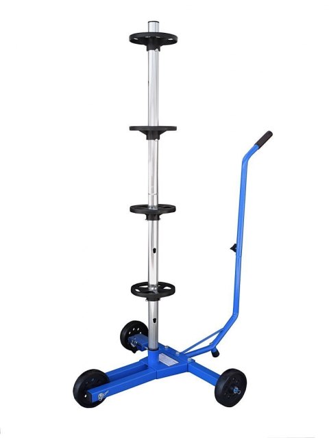 Uchwyt na opony wyposażony jest w rączkę oraz kółka jezdne co ułatwi transportowanie go, nawet z załadowanymi felgami, a także pozwoli na utrzymanie porządku w garażu, nie zajmując zbyt dużo miejsca.