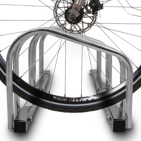 Metalowy stojak na rowery nada się zarówno pod daszek jak i na otwartą przestrzeń, jest wykonany z dobrej jakości metalu, dzięki czemu jest on odporny na warunki atmosferyczne. Wyposażony w otwory ma możliwość stabilizacji do podłoża. Stojak serwisowy nada się do rowerów, które mają szerokość opon od 35 do 60 mm, jest to standardowa szerokość opony dla rowerów, więc praktycznie dopasowany jest pod wszystkie pojazdy jednośladowe.