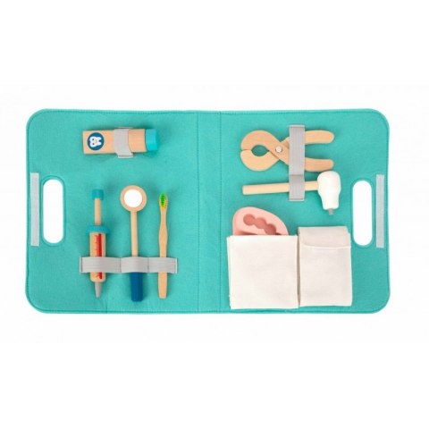 Drewniane narzędzia w torbie dla małego dentysty od marki TOOKY TOY. Ten zestaw zawiera wszystko, czego potrzebuje Twój mały lekarz do zabawy w dentystę. Przyszli lekarze mogą robić zastrzyki, wyrywać oraz sprawdzać stan zębów u swoich pacjentów. Zabawa w Dentystę to nie tylko jedna z zabaw na odgrywanie ról, to również nauka dbania o higienę oraz skutki jej braku. Uczy także empatii i współodczuwania, co jest bardzo ważne w relacjach społecznych. Wspiera rozwój wyobraźni i uczy rozwiązywania problemów.
