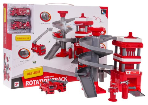 Remiza Strażacka z funkcją wody, zjeżdżalnią i autkami strażackimi w zestawie dla dzieci od 3-go roku życia. Na dachu remizy strażackiej znajduje się pojemniczek na wodę. Po nalaniu wody do pojemniczka i naciśnięciu przycisku znajdującego się obok zbiorniczka, z przedniej części dachu będzie wydobywać się woda. Na dole remizy znajduje się garaż dla pojazdów strażackich z ruchomym szlabanem. Do zestawu dołączono dwa autka strażackie z metalową karoserią, dodatkowo drabina w jednym wozie strażackim podnosi się i opuszcza, a także wysuwa. W zestawie znajdziemy również hydrant oraz gaśnicę.