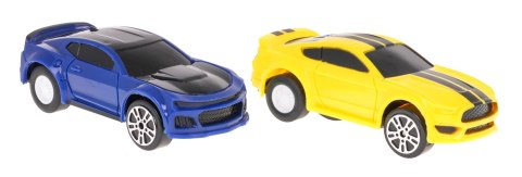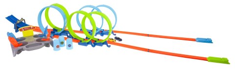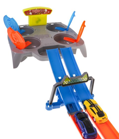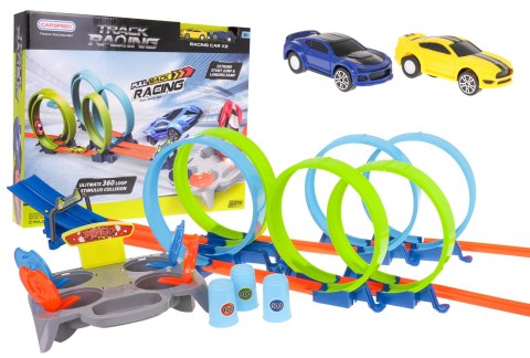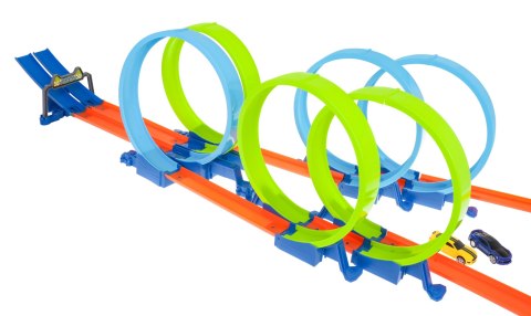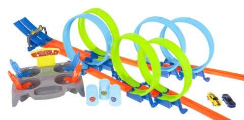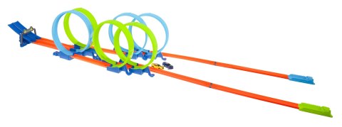 Podwójny tor wyścigowy z pętlami 360 stopni oraz dwoma samochodzikami w zestawie to propozycja dla dzieci od szóstego roku życia. Dzięki swojej konstrukcji równocześnie bawić nim może się dwójka dzieci. Autka dołączone do zestawu posiadają napęd Pull Back, należy je umieścić na torze, a następnie pchnąć do tyłu. Samochodziki pojadą do przodu, pokonają ostre pętle, a następnie pomkną torem do przodu i wjadą na rampę, by z niej poszybować w górę i strącić przeszkody w postaci celów lub beczek. Cele i beczki znajdują się na oddzielnej podkładce, na niej jest również panel dźwiękowo-świetlny. Samochodzik uderzając w panel, uruchamia migające światełka oraz odgłosy fanfar i okrzyków. Panel zasilany jest bateriami typu 2 x AA 1,5 V, baterii brak w zestawie. |