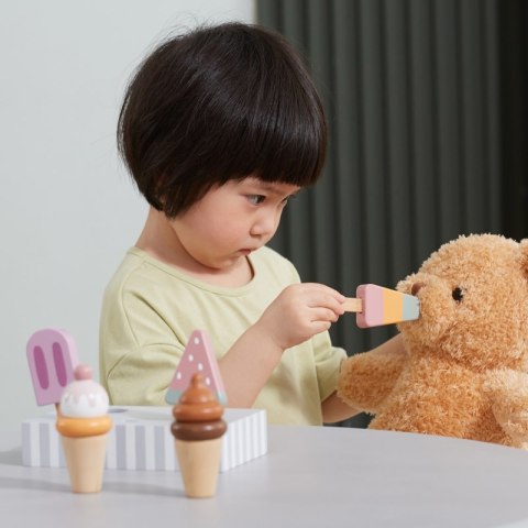 Drewniany zestaw pięciu lodów idealnych na deser w upalny dzień. Lody w pięknej, smakowitej kolorystyce wykonane ze starannością o każdy szczegół. Ten drewniany zestaw świetnie sprawdzi się w zabawie w sklep, jak również jako akcesoria wyposażenia dziecięcej kuchni. Świetna jakość wykonania, urocza kolorystyka, praktyczność i funkcjonalność. Zabawa w dom, zabawa w sklep i naśladowanie ról dorosłych - to kreatywny sposób na kształtowanie relacji społecznych, oraz rozwijanie i poznawanie słownictwa.