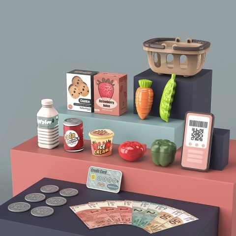 - - do zestawu dołączono: koszyk na zakupy, warzywa, owoce, paczkę ciasteczek, kartę płatniczą, sztuczne banknoty i monety, telefon, butelkę wody, colę i lody,
