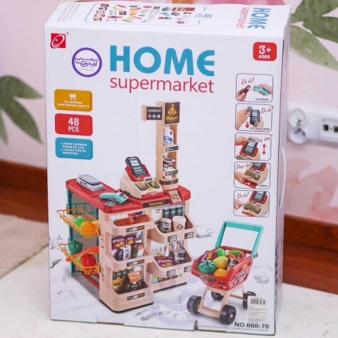 WOOPIE Sklep Supermarket z Wózkiem Sklepowym Waga Kasa Skaner + 48 Akc.