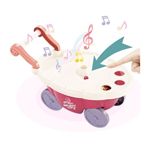 - - posiada funkcję dźwiękowe (melodie włączane za pomocą guzika na blacie wózka) oraz świetlne (kolorowy świecący trzon parasolki)