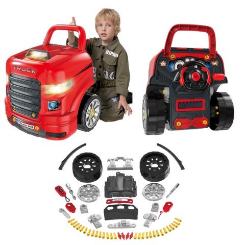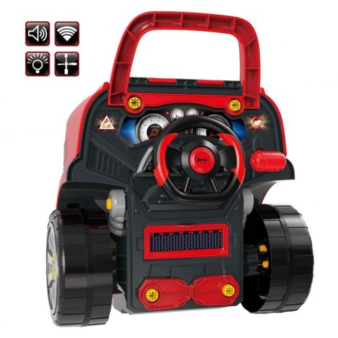 Zabawka imitująca przód ciężarówki marki WOOPIE z podnoszoną maską, kierownicą oraz deską rozdzielczą. Po otworzeniu schowku pod kierownicą dziecko znajdzie w środku mnóstwo atrakcji w postaci narzędzi, pokręteł i śrub. Młody mechanik może dokonywać wielu napraw i przeglądów swojego pojazdu (np. kół, błotników, silnika, świec zapłonowych, grilla chłodnicy). Zabawka wyposażona jest w moduł dźwiękowy (odgłosy silnika i klakson) i świetlny (świecą reflektory). Dodatkowo w zestawie jest pilot umożliwiający sterowanie modułami. W celu zdjęcia kół można zastosować umieszczony w zabawce podnośnik. Z całą pewnością jest to zestaw jedyny w swoim rodzaju, oferujący niezliczoną ilość możliwości zabawy.