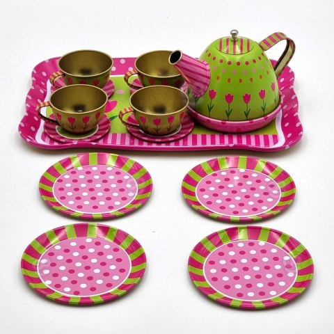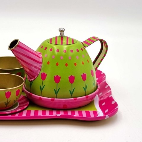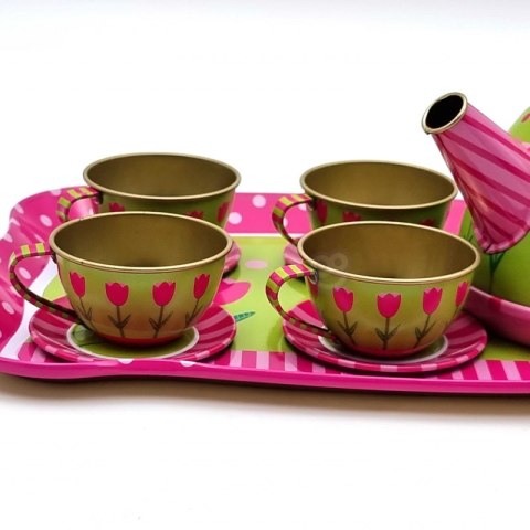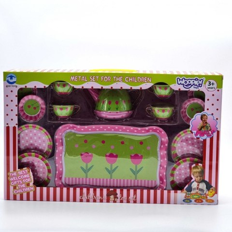 Zestaw do herbaty firmy Woopie to coś czego Twój maluch potrzebuje. Zestaw jest metalowy co daje pewność że nie zniszczy się tak szybko, nawet przy upadku. W pudełku jest dzbanuszek, filiżanki, talerzyki i talerze oraz duża tacka z namalowanymi kwiatuszkami. Zestaw przeznaczony dla dzieci od 3 roku.