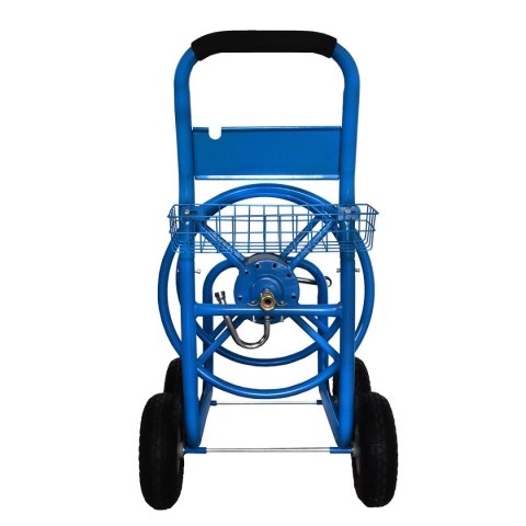 Stalowy wózek ogrodowy ze szpulą do zwijania węża. Solidna stalowa konstrukcja udźwignie wąż o średnicy 3/4" i długości 70m Zastosowanie 4 pompowanych kół sprawia, że wózek łatwo się prowadzi. Uchwyt do prowadzenia wózka posiada antypoślizgowa powierzchnię dlatego można nim pewnie sterować.. Wózek został wyposażony w korbę, dzięki której szybko zwiniesz wąż na bęben.