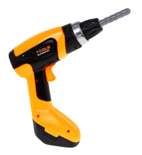 Zestaw narzędzi dla dzieci od 3-go roku życia. Zestaw zawiera 26 elementów, wszystko co niezbędne małemu majsterkowiczowi: kołki, śrubki, śrubokręt, klucze, młotek, piłę do metalu a przede wszystkim wiertarko-wkrętarkę która zasilana jest bateriami typu 2 x AA (brak w zestawie). Podczas wkręcania lub wykręcania narzędzie wydaje charakterystyczne odgłosy pracy. |