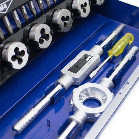 Zestaw 32 elementów do gwintowania. Nadaje się do większości materiałów o wytrzymałości do 900 N/mm2: stal, tworzywa sztuczne, miękkie i twarde drewno. Niezbędne dla profesjonalistów jak i zarówno dla amatorów. Wykonane ze stali z dodatkiem wolframu co zapewnia wysoką wytrzymałość.