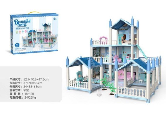• 3-piętrowy domek dla lalek Prezent dla dziewczynek 6+ Niebieska willa z wyposażeniem