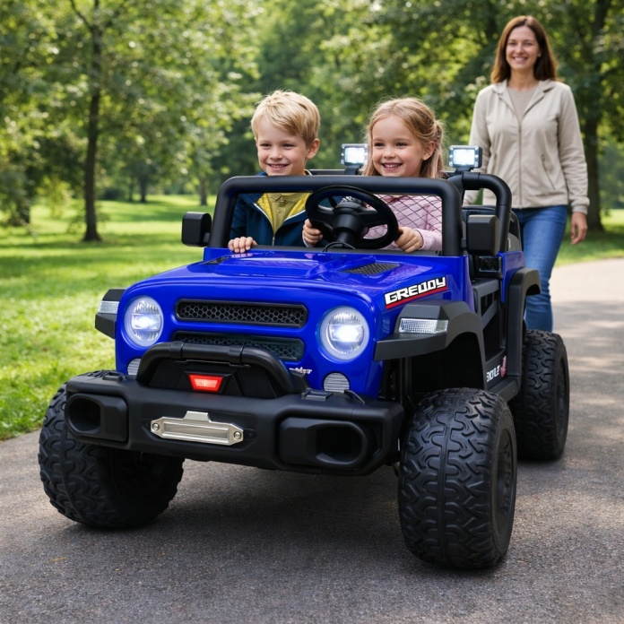 Pojazdem można sterować zarówno za pomocą pilota (przez rodzica) lub dziecko może to robić samodzielnie, siedząc za kierownicą.