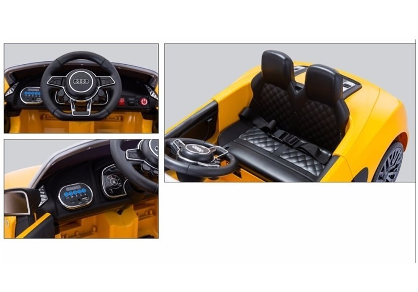 Prezentowany roadster Audi R8 pod swą sportową maską ukrywa szereg udogodnień, podnoszących bezpieczeństwo i komfort każdego dziecka. Wewnątrz pojazdu znajduje się miękka, dwuosobowa kanapa połączona z pasem biodrowym. Wykonano ją z czarnej skóry ekologicznej ozdobionej stylizowanym pikowaniem. Na koniec zostawiliśmy coś, co sprawi, że każda podróż żółtym modelem Audi R8 Spyder będzie fantastycznym doświadczeniem — wewnątrz autka znajduje się radio FM, które bez najmniejszych trudności można połączyć z odtwarzaczem MP3 lub pamięcią USB.