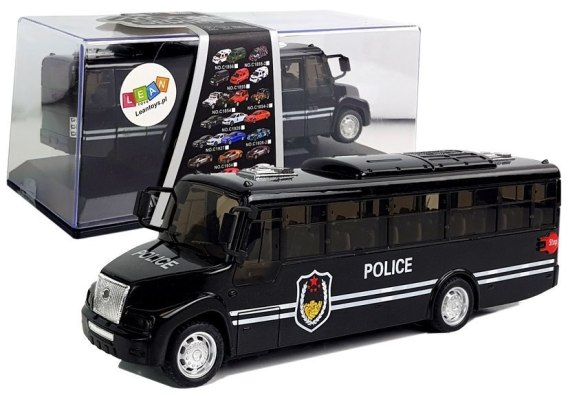 Pudełko w które jest zapakowane, będzie ładnie prezentować się na półce. Autobus posiada napędem pull-back, wykonany został z plastiku na gumowych oponach. Wnętrze auta ma odwzorowany każdy detal, który będzie przypominał prawdziwy odpowiednik. Na bokach czarnego autka widnieje biały napis POLICE i charakterystyczne naklejki. Zabawka rozbudzi w Twoim dziecku dużą ciekawość i na pewno jedno z tych autek dołączy do jego kolekcji.