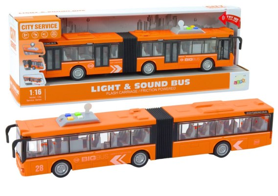 Autobus przegubowy w skali 1:16 w pomarańczowym kolorze oferuje realistyczne efekty dźwiękowe i świetlne, napęd frykcyjny oraz otwierane drzwi. Dzięki tym funkcjom, zabawka dostarcza autentycznych wrażeń.
