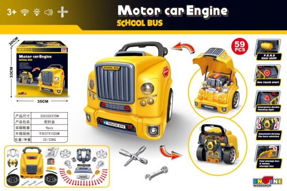 Interaktywna zabawka, przód żółtego autobusu szkolnego z podnoszoną maską oraz deską rozdzielczą przeznaczony dla dzieci od 3-go roku życia. Komplet zawiera części do złożenia przodu autobusu oraz narzędzia potrzebne w montażu i demontażu części takie jak śrubokręt, czy klucze. Pod maską autobusu znajduje się duży rozkręcany silnik, który dziecko może rozłożyć na czynniki pierwsze. Do wymiany nadają się także świece zapłonowe oraz koła. Na desce rozdzielczej znajduje się przycisk startu pojazdu z odgłosami zapalania silnika, kierownica z klaksonem oraz sygnalizator awaryjny. Pod kierownicą umiejscowiony jest schowek, do którego można włożyć wszystkie niezbędne narzędzia, śruby, pokrętła. Zabawka posiada wygodną rączkę do przenoszenia. Zasilanie bateriami typu 3 x AA 1,5 V (brak w zestawie). Zabawka dla małego mechanika rozwija umiejętności manualne, małą motorykę oraz koordynację oko-ręka. Funkcje: - podnoszona maska autobusu, - rozkręcany silnik, - odgłos zapalania silnika, jazdy, cofania, - klakson w kierownicy, - sygnalizator awaryjny, - świecące reflektory, - oświetlenie silnika, - schowek na narzędzia, - drążek zmiany biegów, - wygodna rączka do przenoszenia, - ruchoma kierownica. |