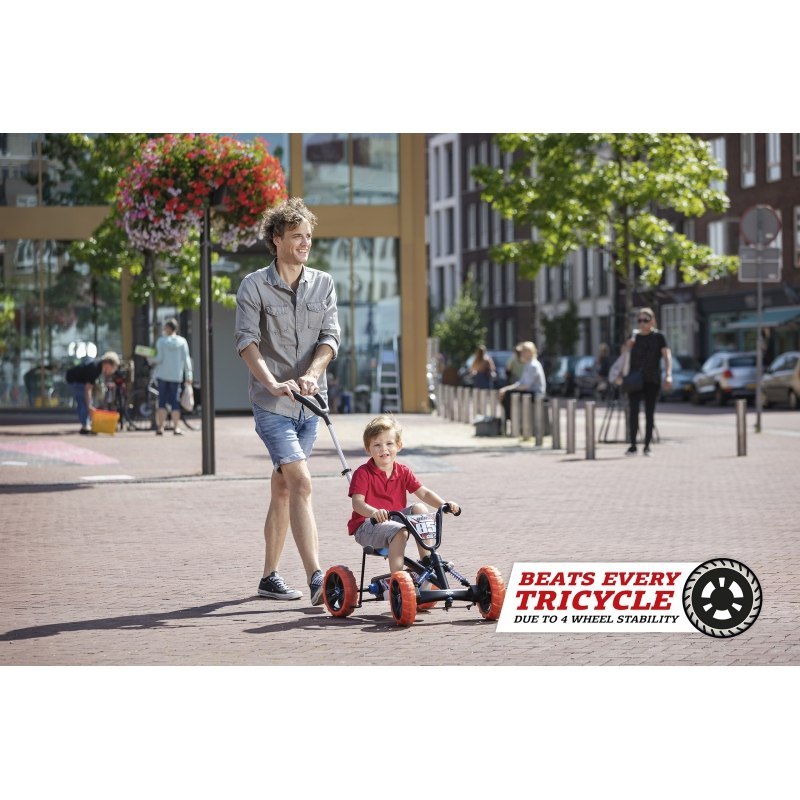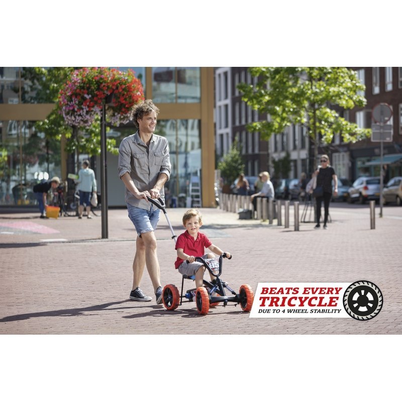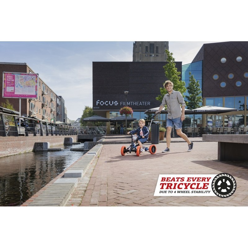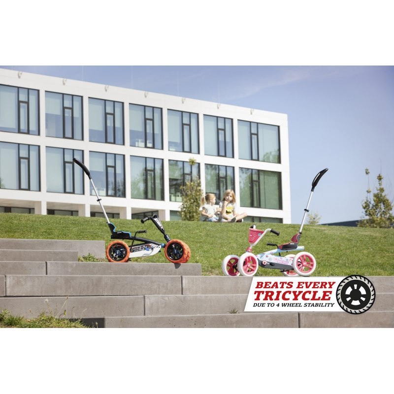 Gokart Buzzy Nitro 2w1 to nietuzinkowy pojazd firmy BERG. Posiada 4 koła, dlatego jest stabilny i gwarantuje przyjemną jazdę. Konstrukcja pojazdu zapewnia dziecku wygodę - sprawia, że stopy malucha trzymają się pedałów również podczas trudniejszych ewolucji. 2w1 - pojazd wyposażony jest w blokadę kierownicy, która zapobiega sterowaniu kierownicy przez dziecko, gdy rodzic prowadzi malucha lub po przełączeniu "trybu", kierownica i pedały mogą być obsługiwane przez dziecko, które zachowuje kontrolę podczas jazdy. Ponadto gokart ma regulowany fotel i hamulec nożny. Został wykonany z trwałych materiałów, wyróżniających się wysoką jakością. Można być pewnym tego, że produkt będzie działał bez zarzutu przez długi czas. Warto też docenić efektowny design tego modelu. Radosne kolory i delikatny wzór spodobają się zarówno dzieciom, jak i ich rodzicom. Jeśli Twoje dziecko nie przepada za trójkołowcami, ten model okaże się strzałem w dziesiątkę!