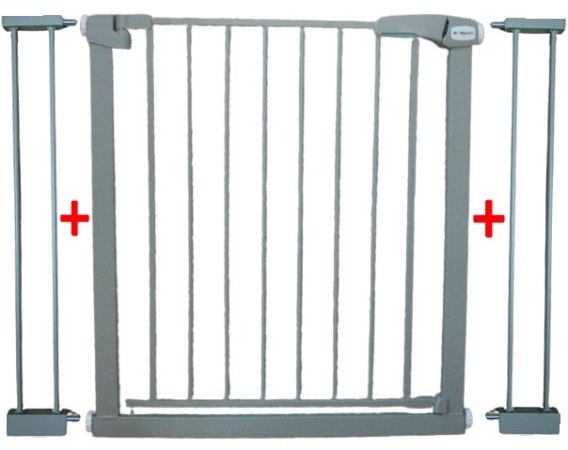Wymiary: wysokość: 78 cm, szerokość bramki z rozszerzeniami (bez śrub) - 91,5 cm otwór montażowy: 79-105 cm otwór montażowy z rozszerzeniami: 100-105 cm minimalna szerokość otworu montażowego (bramka ze śrubami) - 79 cm, minimalna szerokość otworu montażowego (bramka ze śrubami) z rozszerzeniami - 100 cm, maksymalna szerokość otworu montażowego (bramka ze śrubami) - 105 cm szerokość elementów rozszerzających: 10,5 cm (dwa elementy, każdy po 10,5 cm) ilość elementów rozszerzających: 2 wysokość drzwi: 71,5 cm, szerokość drzwi: ok. 58 cm, 4 śruby montażowe z silikonowymi nakładkami, waga: 5/5,5 kg,