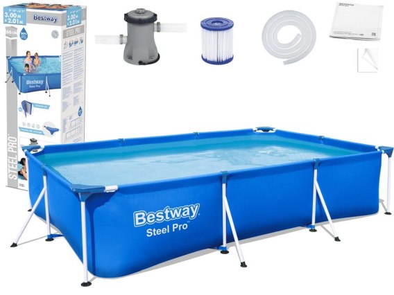 Potrzebujesz czasami ochłody w upalny dzień a nie masz czasu iść na basen miejski lub jechać nad wodę? Dlatego przedstawiamy ten rewelacyjny stelażowy basen przeznaczony do relaksu w upalne dni dla całej rodziny. Rozłożysz go bardzo szybko, napełnisz wodą i relaks gotowy. Duży, prostokątny basen o wymiarach 300 x 201 x 66cm i pojemności 3,300l wody pomieści wszystkie dzieci potrzebujące ochłody. Dla szybkiego spuszczenia wody służą specjalne zawory. O filtrację wody zadba pompa o wydajności 1,249l/h. Produkt wykonano z materiału DuraPlus- jest to materiał z rdzeniem z siatki poliestrowej połączony z dwiema warstwami grubego PVC. Gwarantuje to dużą wytrzymałość i trwałość.