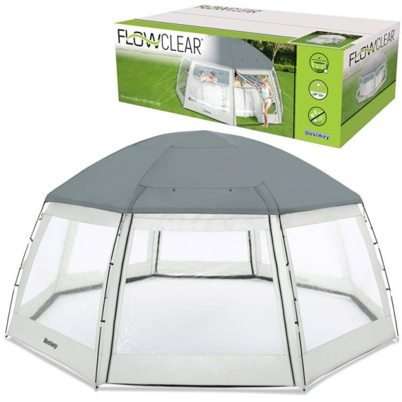 Przenośny namiot, altana Firmy Bestway to rewelacyjne rozwiązanie i jeszcze większy komfort do korzystania z przydomowych basenów ogrodowych. Dzięki zastosowaniu super wytrzymałych materiałów poliestrowych z polimerową powłoką altana jest odporna na przesiąkanie. Przestronna konstrukcja namiotu zapewni komfortową możliwość korzystania z kąpieli w basenie nawet podczas niesprzyjającej aury. W zależności od potrzeby można rozłożyć tylko główną kopułę, która osłoni uczestników kąpieli od mocnego słońca, czy deszczu. Natomiast przy wietrznej pogodzie lub sezonowym ataku komarów, czy innych owadów boczne drzwi oraz moskitiera zapewnią luksus kąpieli. Ważne również jest to, że altana zabezpieczy przed wychładzaniem wody w basenie.