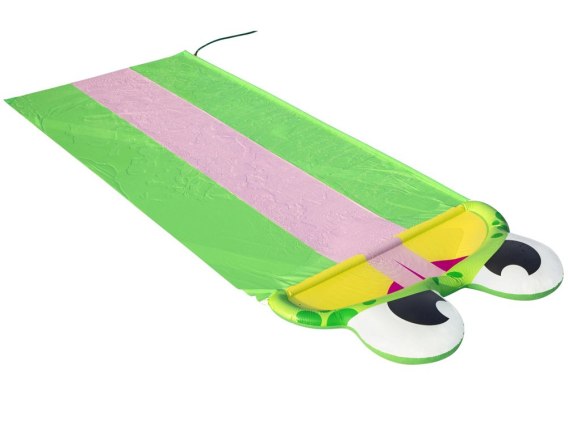 Bestway potrójny ślizg wodny H2O GO! ŻABA, to wesoła propozycja na zabawę od firmy Bestway dla wszystkich dzieci, które lubią aktywnie spędzać czas na świeżym powietrzu. Ślizgawka posiada idealny do urządzania wyścigów szeroki potrójny tor o długości 488cm z wizerunkiem radosnej żaby na końcu mety. Tor jest nawadniany poprzez podłączenie ogrodowego węża do natrysków umieszczonych w zjeżdżalni. Zraszacze wodne wbudowane w zjeżdżalnię zapewniają maksymalny poślizg, spływająca woda utrzymuje ślizgawkę w czystości, a strumienie wody zapewniają ochłodę w upalane dni. Dzięki przemyślanej konstrukcji spływająca woda zbiera się na końcu dmuchanej mety, zapewniając miękkie hamowanie z dużym pluskiem! Aby całość była bardziej stabilna, można dodatkowo napełnić wodą wewnętrzną komorę basenu. Nowoczesna konstrukcja oraz wytrzymały, przetestowany materiał użyty do produkcji ślizgawki, sprawia, że jej eksploatacja będzie łatwa i bezproblemowa. Wystarczy rozłożyć ślizg i urządzić wesoły wyścig, kto pierwszy ten wygrywa! Niesamowita zabawa zapewniona!