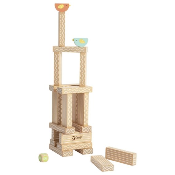 Drewniana gra edukacyjna  od marki CLASSIC WORLD pozwala bawić się maluchom w wiele wyjątkowych gier - tylko wyobraźnia jest ograniczeniem! Gra składa się z 20 prostokątnych klocków, 2 figurek ptaków oraz kostki do gry, wszystkie wykonane z drewna bukowego. Zabawkę można wykorzystać do różnych gier i zabaw. Jedną z najbardziej popularnych jest Zabawa w krzywą wierzę -  to popularna gra zręcznościowa, polegająca na wyciąganiu drewnianych klocków z wieży i układaniu ich na jej szczycie, bez spowodowania zawalenia konstrukcji.