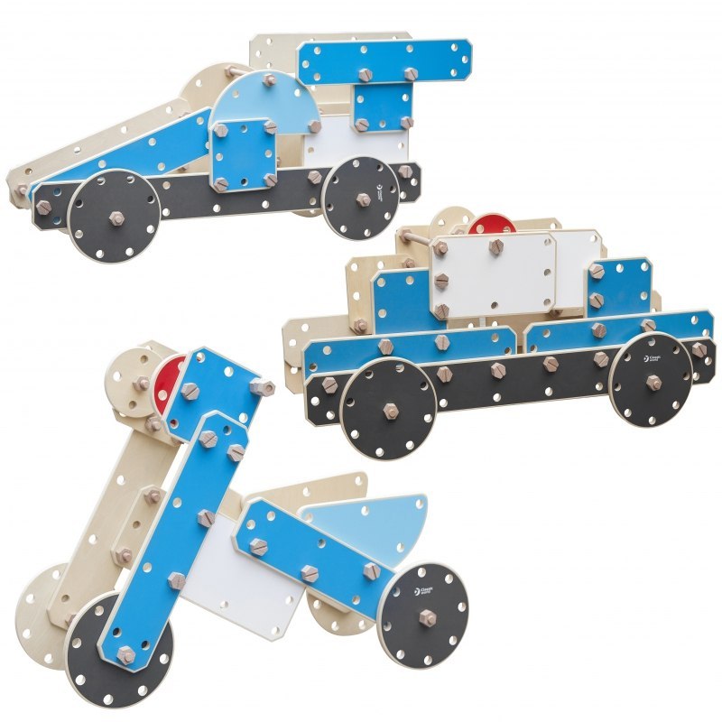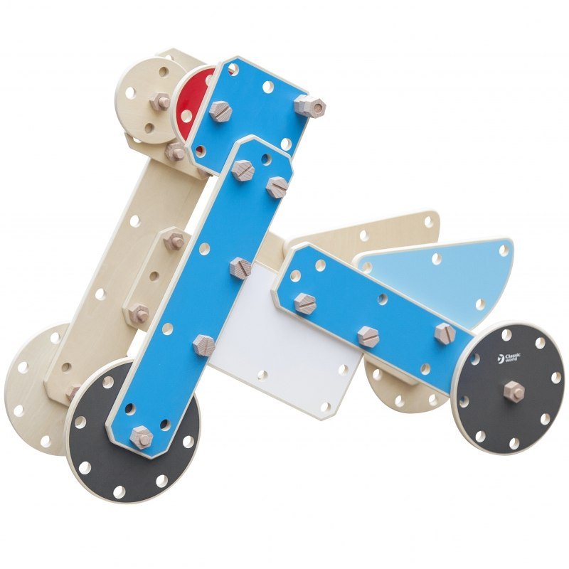 CLASSIC WORLD Drewniane Klocki Konstrukcyjne - Zestaw dużych klocków niebieskie Pojazdy jest to komplet ogromnych klocków drewnianych, składający się z 89 elementów, z których możemy zbudować z twoją pociechą różne pojazdy- radiowóz, motor, rower czy samochód wyścigowy. Doskonały produkt do spełnienia marzeń każdego fana motoryzacji. Zestaw należy złożyć z osobą dorosłą. Produkt rozwija kreatywność i wyobraźnię Twojego dziecka. Zabawa klockami ma pozytywny wpływ na rozwój dzieci. Oddziałuje na ich koncentrację, poprawia koordynację wzrokowo - ruchową, kształtuje umiejętność planowania i umiejętności manualne, dodatkowo uczy też orientacji przestrzennej, precyzji, a także ćwiczy zmysł równowagi! Świetnie sprawdzą się również do nauki pracy zespołowej. Klocki zbudowane z najwyższej jakości drewna i pomalowane nietoksycznymi farbami. Idealnie sprawdzą się do użytku domowego jak również w każdej placówce wczesnoszkolnej. Przeznaczone dla dzieci powyżej 3 roku życia.
