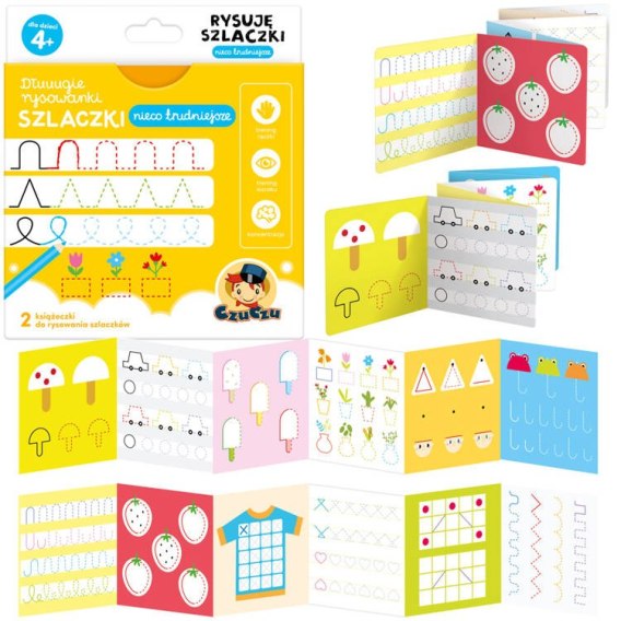 Edukacyjny zestaw zawiera 2 długie książeczki harmonijki, które zachęcają dzieci do sięgania po kredki i rozpoczęcia twórczej zabawy. Ciekawe zadania i kolorowe ilustracje zostały przygotowane z myślą o przedszkolakach. Rysujcie po śladzie i kolorujcie, ćwicząc przy tym zdolności manualne i wyobraźnię.